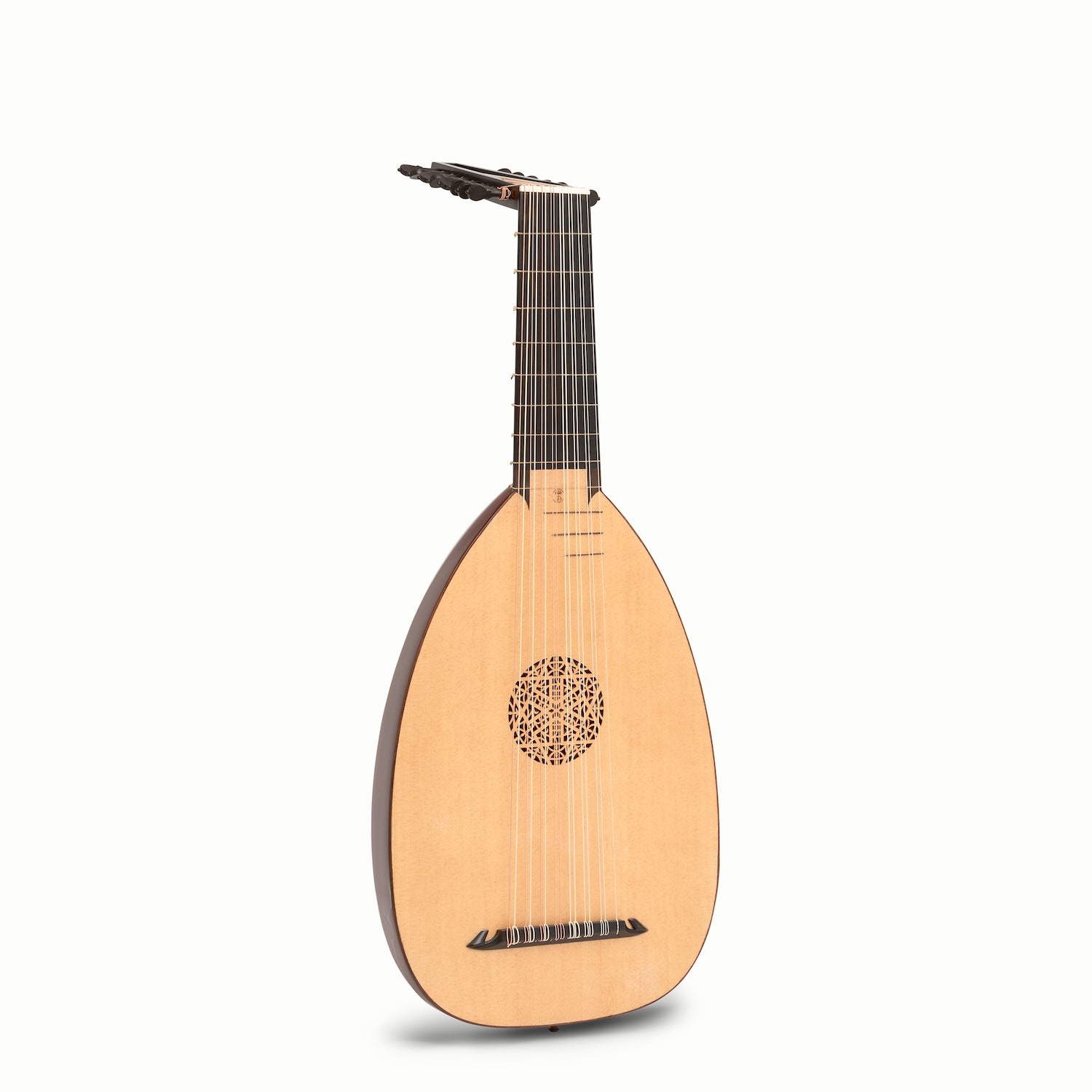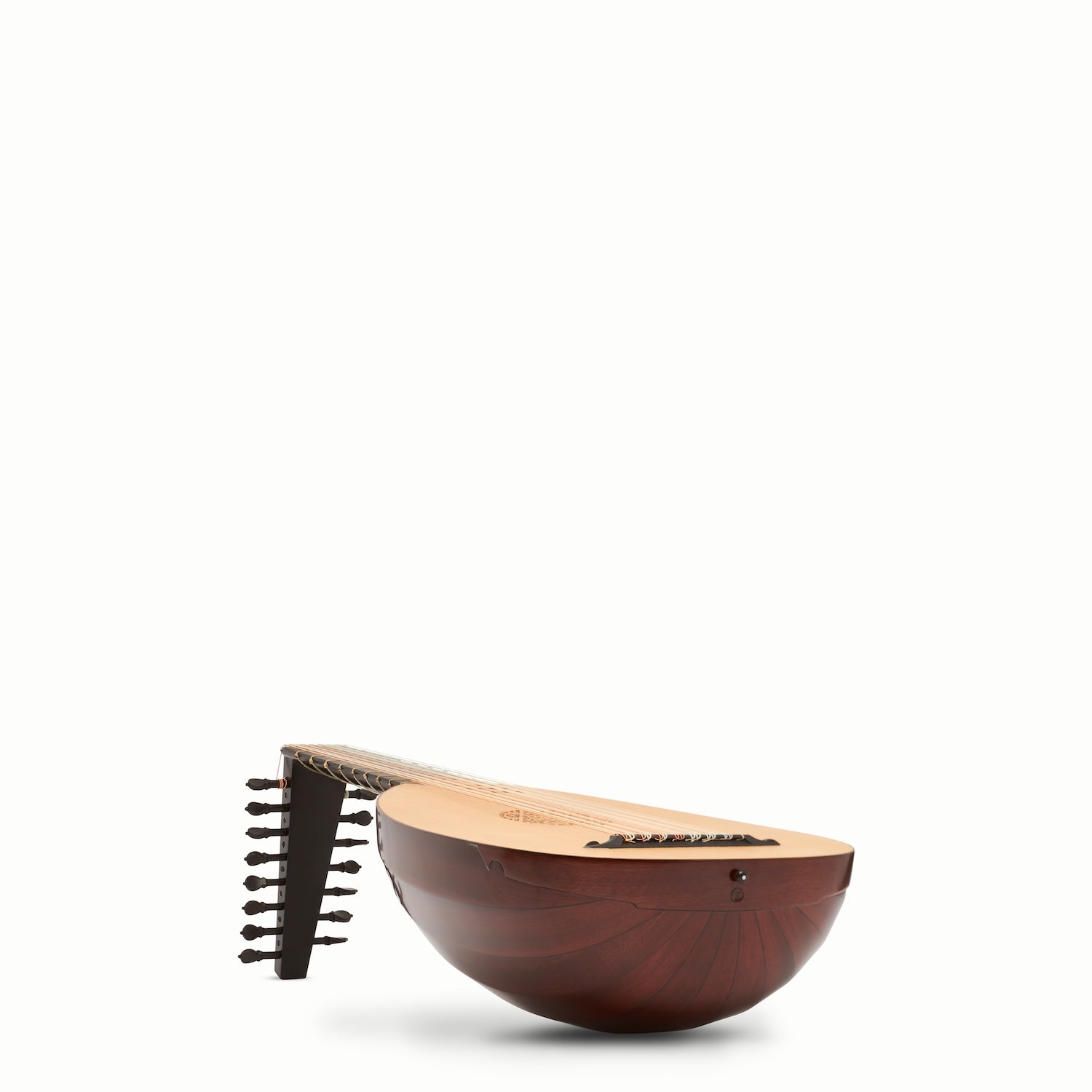 La caisse de résonance du Luth Renaissance 8c LLD® Galilei est construite en sapelli veiné. Ce bois de lutherie dense présente des veinures très reconnaissables formant un dessin attrayant en rubans parallèles au fil du bois. Le sapelli veiné est assez dur, mais reste facile à sculpter.
